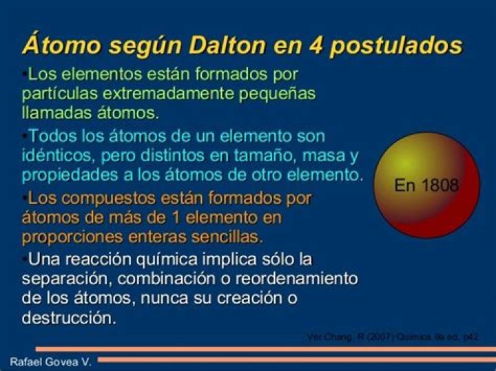 Los postulados básicos de esta teoría son: La materia está dividida en unas partículas indivisibles e inalterables llamadas átomos. Los átomos son partículas muy pequeñas y no se pueden ver a simple vista. Todos los átomos de un mismo elemento son iguales entre sí, igual masa e iguales propiedades.