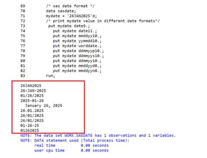 A SAS format is aan instruction that converts the internal numerical value of a SAS variable to a character string that can be printed or displayed. Date formats convert SAS date values to a readable form; datetime formats convert SAS datetime values to a readable form.