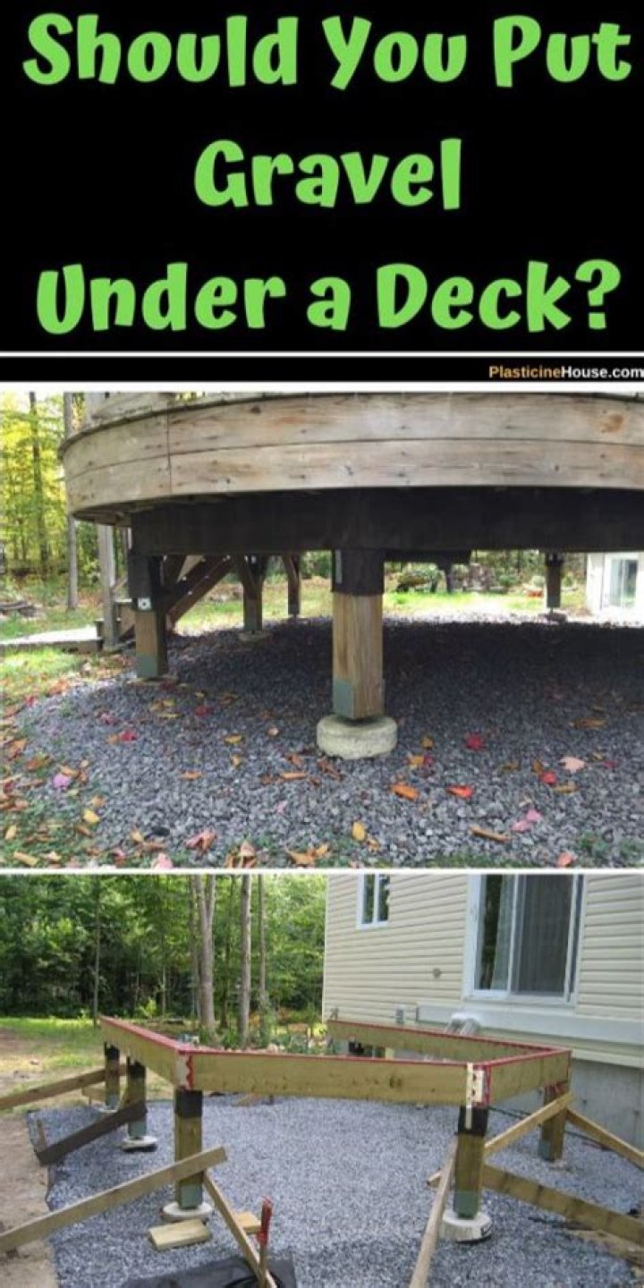 Visual Appeal. In addition to its many functional benefits, gravel layered beneath a deck also adds a certain visual appeal. It covers up ugly plastic or landscape fabric and hides dirt, mud and water from sight for a clean, finished look.