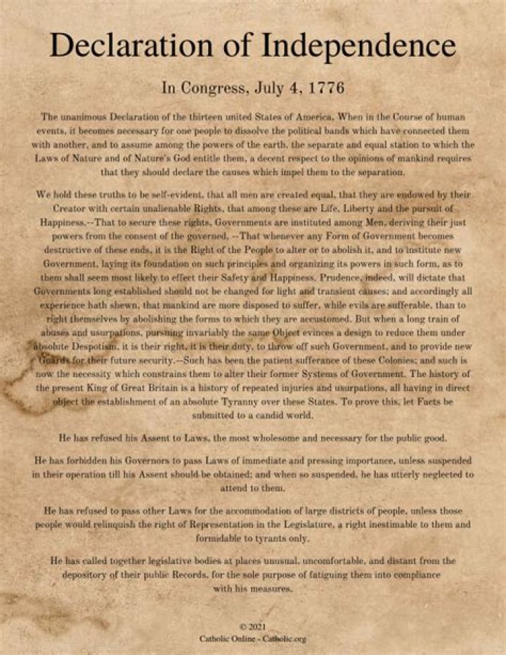 There are four parts to the Declaration of Independence which include the Preamble, A Declaration of Rights, A Bill of Indictment, and A Statement of Independence.