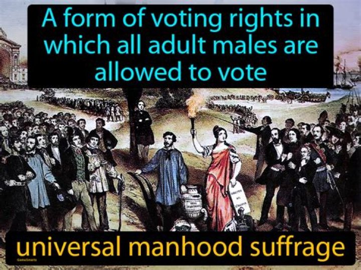 Universal manhood suffrage is a form of voting rights in which all adult males within a political system are allowed to vote, regardless of income, property, religion, or any other qualification besides race.