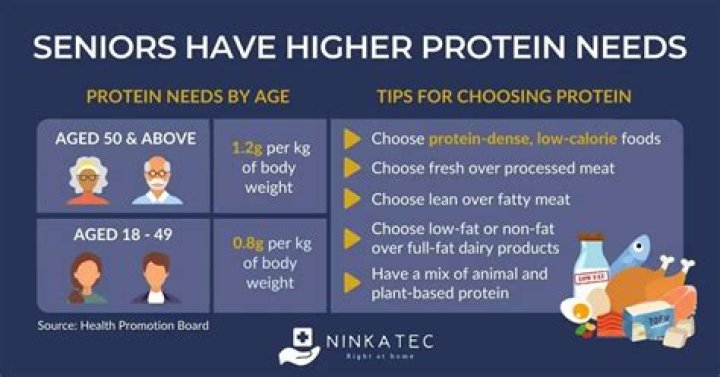 Recent evidence shows that the recommended amounts of protein may be too low for elderly people. Seniors may need 1.0-1.3 grams of protein for every kilogram of body weight. For example, if you weight 180 pounds this could mean consuming 80-104 grams of protein every day, regardless of your calorie intake.